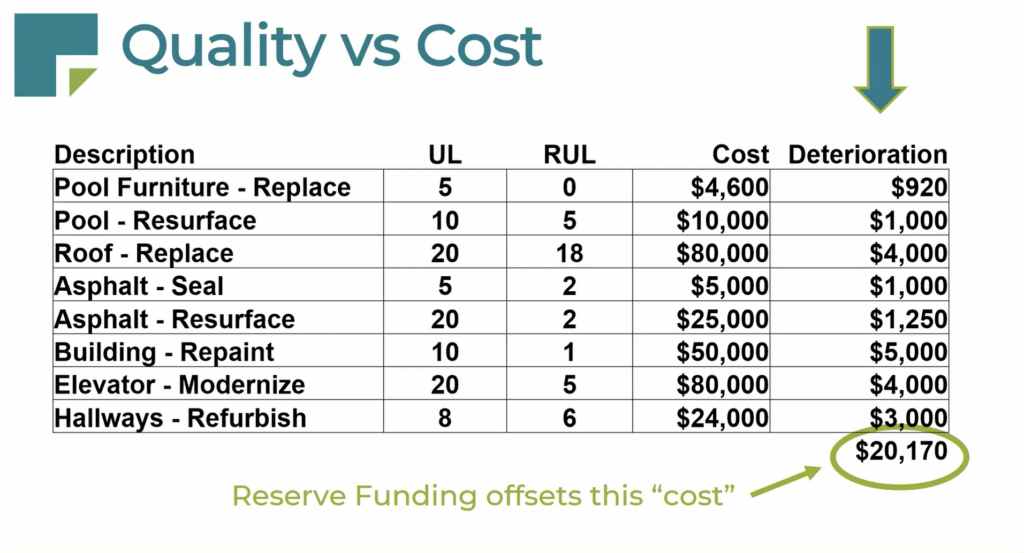To truly maximize your HOA’s cash flow and minimize reserve funding, you need a well-thought-out reserve component list that guides wise decision-making. When reviewing your reserve study, pay close attention to the “deterioration” column, which shows the cost per year for each component. This shows you which projects are truly significant, as the biggest project cost isn’t always the most significant in terms of annual deterioration.